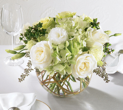 White roses, gorgeous green hydrangea along with white lisianthus accented with eucalyptus and curly willow arranged in a clear glass bubble bowl. Flowers may vary depending on market availability.