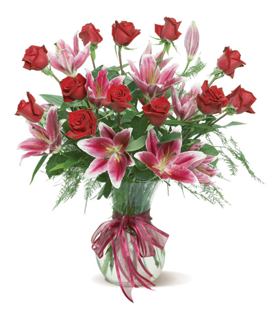 A sweet, fragrant mix of pink oriental lilies and beautiful red roses arranged in a clear glass vase adorned with a pretty ribbon is a luxurious and feminine bouquet that would be pretty for Valentine’s Day, birthdays or other grand occasions.