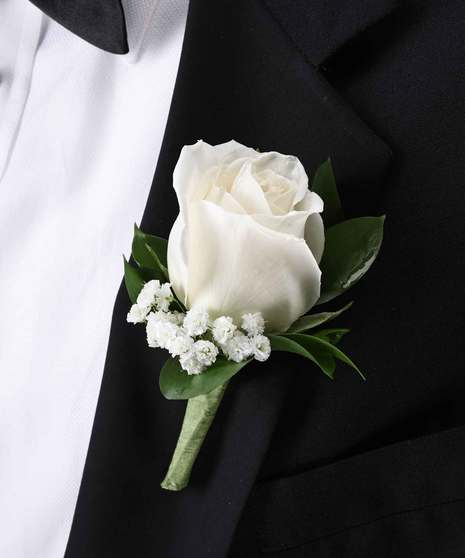 Petite white rose boutonniere with touch of baby’s breath and greenery (pin on style). Upgrade for a magnet instead of pins.