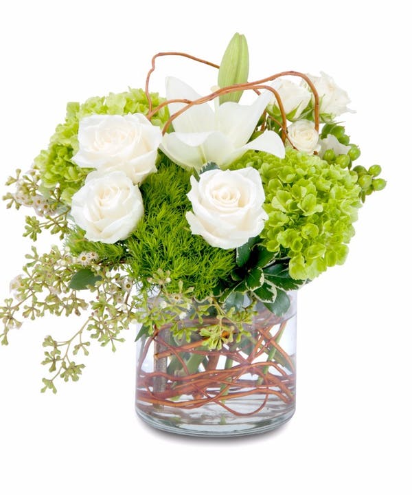 Composition of green and white seasonal flowers accented with willow in a low compact style design.